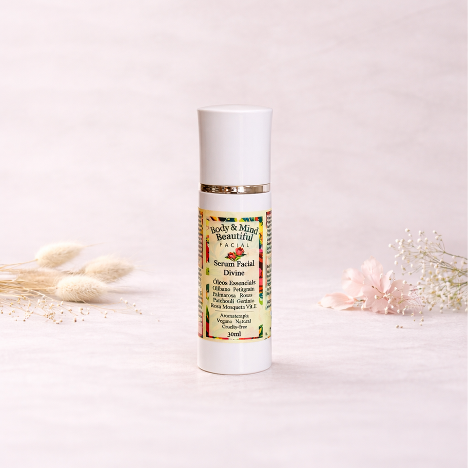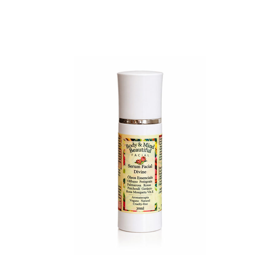 Óleo de Rosa Mosqueta, e Óleos Essenciais de Gerânio, Olíbano, Palmarosa, Benjoim, Petitgrain, Rosas e Patchouli.